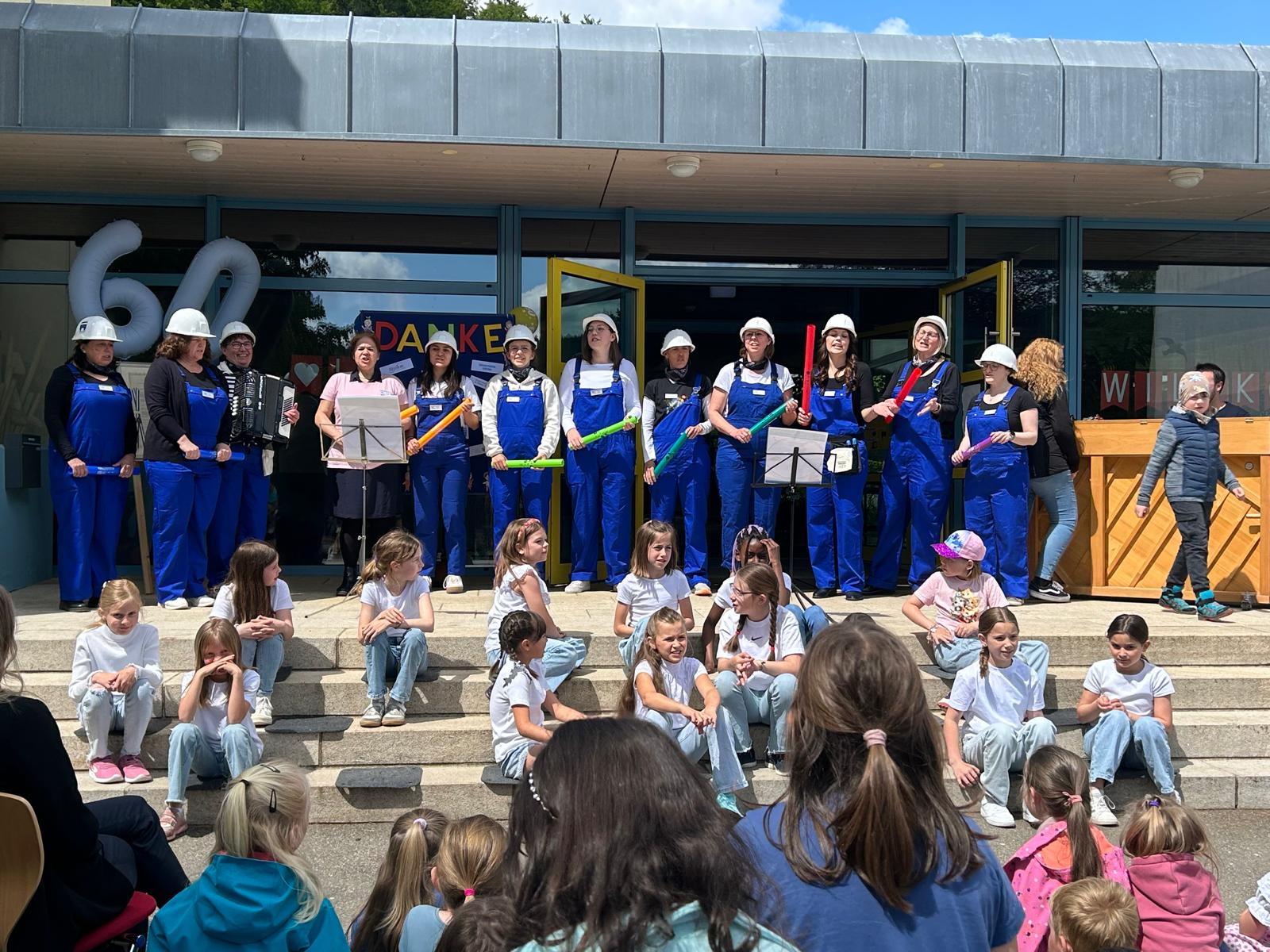 „Vor 60 Jahren fing es an, man baute diese Schule dann. Die Grundsteinlegung erst anstand, danach kam Wand um Wand. Handwerker, die brauchen wir …“ – diesen Gesang hörte man am vergangenen Freitagnachmittag, wenn man sich in der Nähe der Anton-Braun-Grundschule befand und staunte nicht schlecht, als man das gesamte Lehrerkollegium im Handwerkeroutfit erblickte, während sie gemeinsam mit der Schülerschaft zum weltbekannten Lied „Wellermann“, welches Musiklehrerin Veronika Wiedermann für diese Feierlichkeit umgeschrieben hatte, sangen.